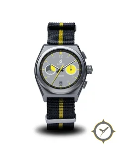 A Chronograph watch with a vintage-inspired 35.5mm case, crafted from titanium featuring a gray dial with a unique matte finish.