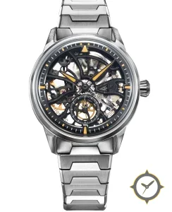 A Skeleton watch with a versatile 38.5mm case, that suits most wrists, crafted from stainless steel featuring a black dial with a unique open-work / skeleton (exposed movement) finish.