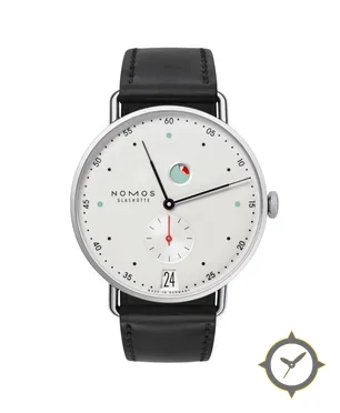 A Minimalist watch with a bold 42.5mm presence on the wrist, crafted from stainless steel featuring a white dial with a unique matte finish and a helpful power reserve indicator.