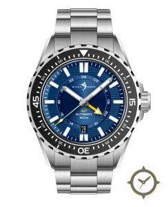 A GMT watch with a versatile 40.5mm case, that suits most wrists, crafted from stainless steel featuring a blue dial with a unique sunburst with horizontal ribbed lines finish and a true GMT complication for tracking a second time zone.