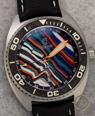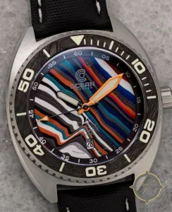 A Dive watch with a bold 47mm presence on the wrist, crafted from stainless steel featuring a blue dial with a unique multicolored marbled lacquer with metallic flakes finish.