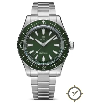 A Dive watch with a versatile 39mm case, that suits most wrists, crafted from stainless steel featuring a green dial with a unique matte finish.