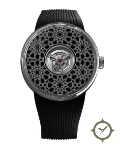 A Skeleton watch, crafted from stainless steel featuring a black dial with a unique open-work skeleton lattice (filigree geometric cutout) finish.