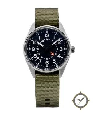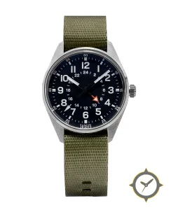 A Field watch with a bold 42mm presence on the wrist, crafted from stainless steel featuring a black dial with a unique matte finish.