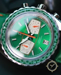 A Chronograph watch with a versatile 39mm case, that suits most wrists, crafted from stainless steel featuring a green dial with a unique sunburst finish.