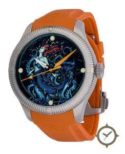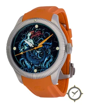 A Dive watch with a vintage-inspired 37.5mm case, crafted from stainless steel featuring a black dial with a unique illustrated/printed artwork finish.