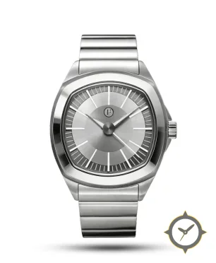 A Sports watch with a bold 44mm presence on the wrist, crafted from stainless steel featuring a silver dial with a unique sunburst brushed finish.
