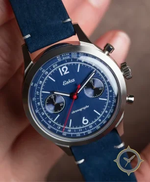 A Chronograph watch with a bold 46mm presence on the wrist, crafted from stainless steel featuring a blue dial with a unique brushed finish.