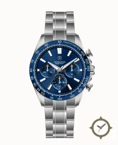 A Chronograph watch with a bold 44.5mm presence on the wrist, crafted from stainless steel featuring a blue dial with a unique sunburst finish.