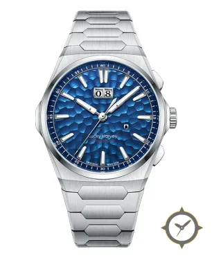 A Luxury watch with a bold 44mm presence on the wrist, crafted from stainless steel featuring a blue dial with a unique hammered/mosaic textured finish (sunburst/guilloché-like) finish.
