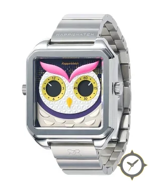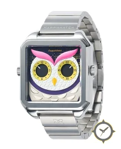 A Dress watch with a vintage-inspired 34.5mm case, crafted from stainless steel featuring a white dial with a unique embossed geometric/faceted texture on owl face with matte printed background finish.
