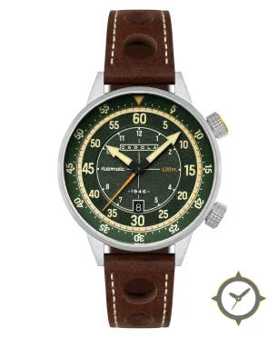 A Pilot watch with a bold 54.5mm presence on the wrist, crafted from stainless steel featuring a green dial with a unique grained/pebbled texture finish.