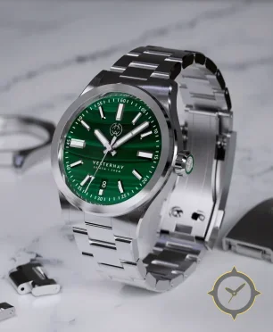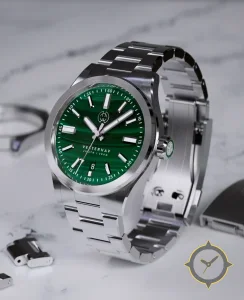 A Sports watch with a vintage-inspired 36mm case, crafted from stainless steel featuring a green dial with a unique malachite-style striated finish finish.