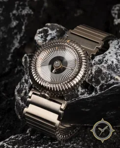 A Luxury watch with a vintage-inspired 31mm case, crafted from stainless steel featuring a silver dial with a unique radial guilloche / ribbed sunburst finish.