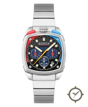 A Chronograph watch with a bold 41.5mm presence on the wrist, crafted from stainless steel featuring a black dial with a unique matte black with glossy elements and contrast colored outer chapter finish.