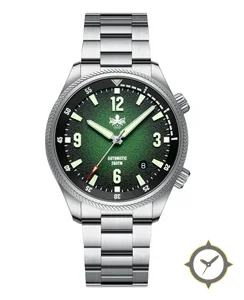 A Dive watch with a bold 42.5mm presence on the wrist, crafted from stainless steel featuring a green dial with a unique textured (granular) finish.