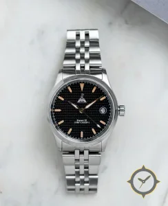 A Dress watch with a bold 42mm presence on the wrist, crafted from stainless steel featuring a black dial with a unique waffle / hobnail texture finish.