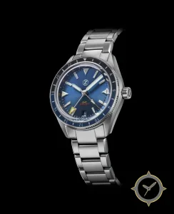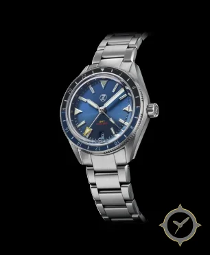 A GMT watch with a vintage-inspired 35.5mm case, crafted from stainless steel featuring a blue dial with a unique sunburst finish and a true GMT complication for tracking a second time zone.