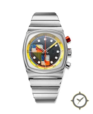 A Chronograph watch with a vintage-inspired 32mm case, crafted from stainless steel featuring a black dial with a unique grained/textured finish finish.