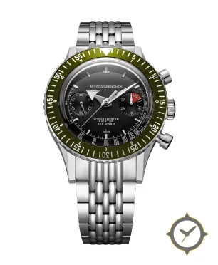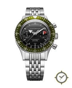 A Chronograph watch with a vintage-inspired 32.5mm case, crafted from stainless steel featuring a black dial with a unique matte finish, perfect for the global traveler with its world-time function.