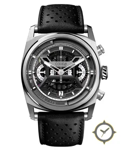 A Skeleton watch with a vintage-inspired 33.5mm case, crafted from stainless steel featuring a black dial with a unique open-worked / skeleton with layered bridges finish.