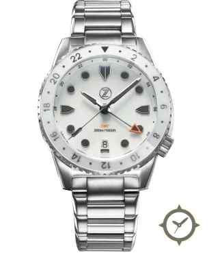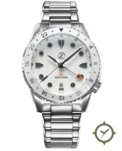 A GMT watch with a bold 46mm presence on the wrist, crafted from stainless steel featuring a white dial with a unique matte finish and a true GMT complication for tracking a second time zone.
