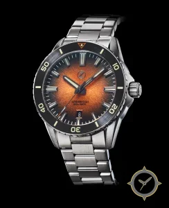 A Dive watch with a bold 47mm presence on the wrist, crafted from stainless steel featuring a orange dial with a unique sunburst (radial textured) finish.