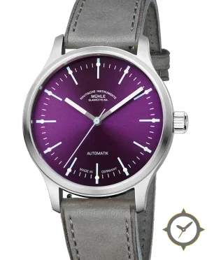 A Minimalist watch with a bold 42.5mm presence on the wrist, crafted from stainless steel featuring a purple dial with a unique sunburst finish.