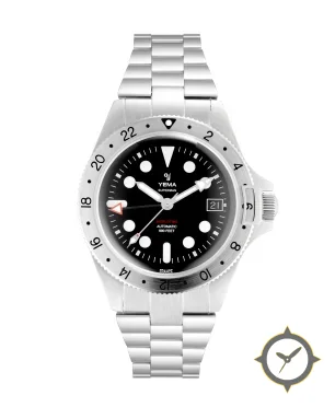 A Dive watch with a bold 46mm presence on the wrist, crafted from stainless steel featuring a black dial with a unique matte finish and a true GMT complication for tracking a second time zone.