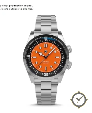 A Dive watch with a bold 43mm presence on the wrist, crafted from stainless steel featuring a orange dial with a unique matte finish.