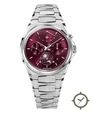 A Luxury watch with a versatile 40mm case, that suits most wrists, crafted from stainless steel featuring a crimson dial with a unique sunburst finish and a beautiful moonphase display.