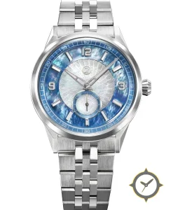 A Luxury watch with a versatile 39mm case, that suits most wrists, crafted from stainless steel featuring a blue dial with a unique mother-of-pearl outer ring with guilloché (sunburst) center finish.