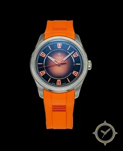 A Sports watch with a vintage-inspired 35mm case, crafted from stainless steel featuring a blue dial with a unique fumé / sunburst gradient (orange center to dark blue outer) finish.