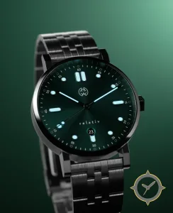 A Minimalist watch with a versatile 38mm case, that suits most wrists, crafted from stainless steel featuring a green dial with a unique sunburst finish.