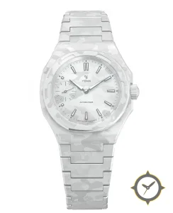 A Sports watch with a vintage-inspired 37.5mm case, crafted from stainless steel featuring a white dial with a unique matte finish with subtle camouflage relief finish.
