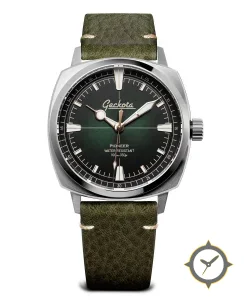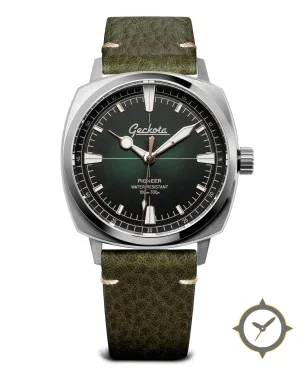A Field watch with a vintage-inspired 35.5mm case, crafted from stainless steel featuring a green dial with a unique sunburst finish.
