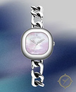 A Dress watch, crafted from stainless steel featuring a white dial with a unique mother-of-pearl finish.