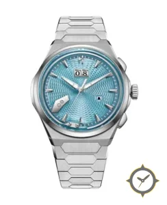A Luxury watch with a bold 44mm presence on the wrist, crafted from stainless steel featuring a turquoise dial with a unique guilloche (engine-turned) finish.