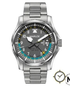 A Aviation watch with a versatile 40.5mm case, that suits most wrists, crafted from stainless steel featuring a gray dial with a unique matte finish and a true GMT complication for tracking a second time zone.