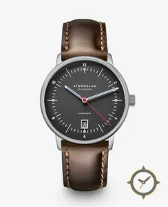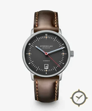 A Minimalist watch with a vintage-inspired 35.5mm case, crafted from stainless steel featuring a gray dial with a unique matte/grain finish.