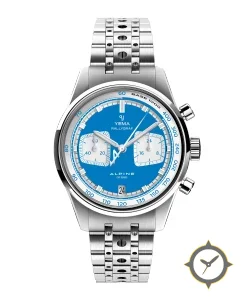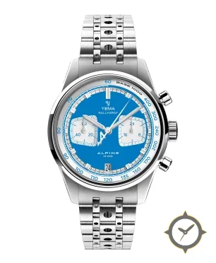 A Racing watch with a vintage-inspired 36mm case, crafted from stainless steel featuring a blue dial with a unique lacquer finish.