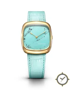 A Dress watch with a versatile 38.5mm case, that suits most wrists, crafted from gold featuring a turquoise dial with a unique turquoise stone (howlite-style marble) finish.