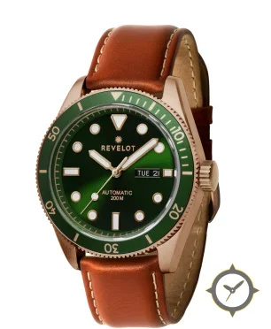 A Dive watch with a bold 48mm presence on the wrist, crafted from bronze featuring a green dial with a unique sunburst finish.