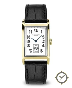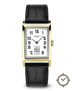 A Dress watch with a vintage-inspired 20.5mm case, crafted from gold featuring a white dial with a unique smooth finish.