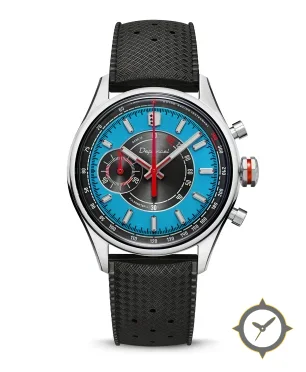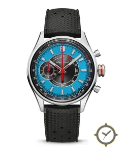 A Racing watch with a versatile 38mm case, that suits most wrists, crafted from stainless steel featuring a turquoise dial with a unique sunburst center with matte turquoise outer ring finish.