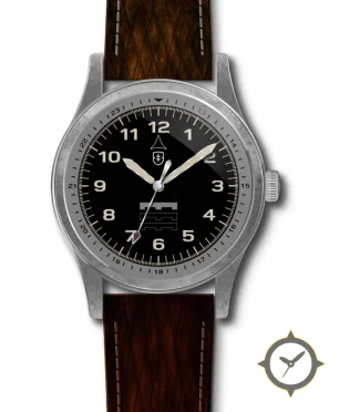 A Pilot watch, crafted from stainless steel featuring a black dial with a unique matte finish and a true GMT complication for tracking a second time zone.