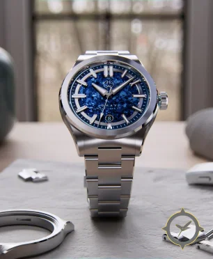 A Sports watch with a vintage-inspired 37mm case, crafted from stainless steel featuring a blue dial with a unique marbled/stone finish.
