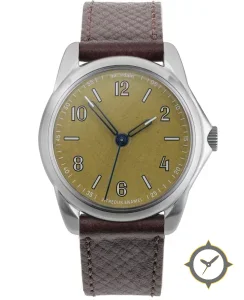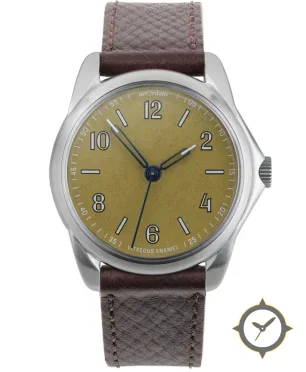 A Field watch with a versatile 40.5mm case, that suits most wrists, crafted from stainless steel featuring a yellow dial with a unique vitreous enamel, speckled/granular finish.