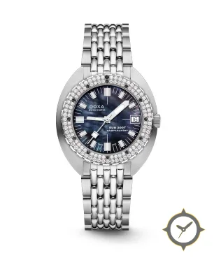 A Dive watch with a versatile 38.5mm case, that suits most wrists, crafted from stainless steel featuring a blue dial with a unique mother-of-pearl finish.