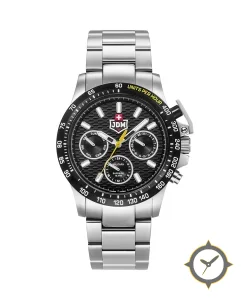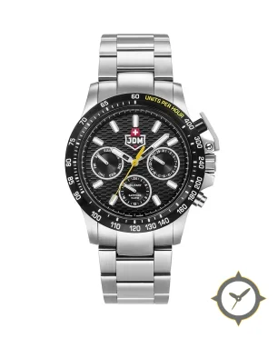 A Chronograph watch with a bold 52.5mm presence on the wrist, crafted from stainless steel featuring a black dial with a unique textured waffle/grid pattern finish.